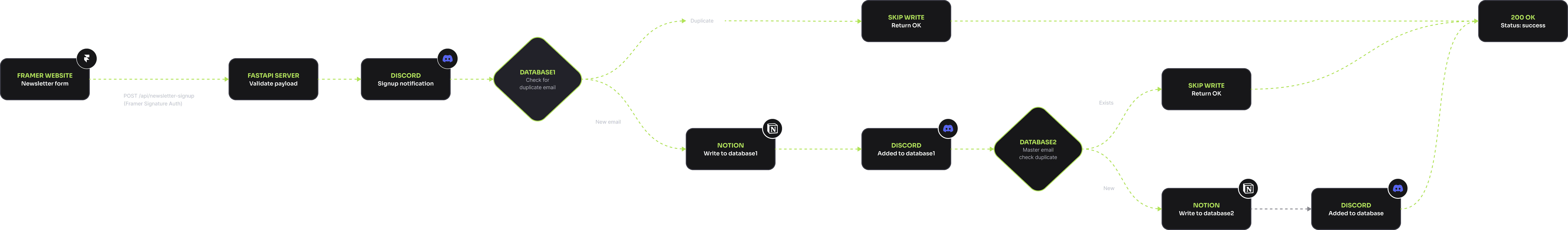 Webhook submissions verified with cryptographic signatures, routed to the right handler, and processed through five sequential operations — notification, dedup, database write, follow-up email, and optional voice call scheduling. Each step is independent, so a failure in one never blocks the others.