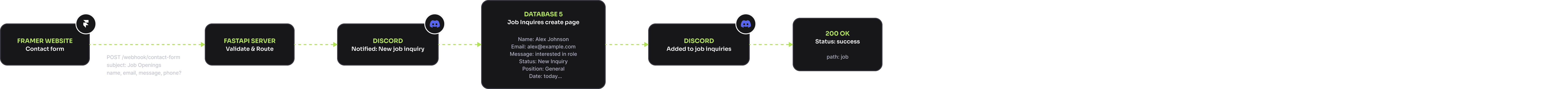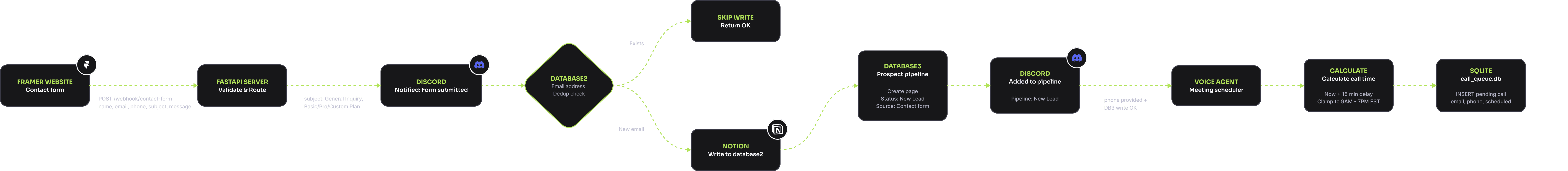 The contact and booking systems are where the website stops being a brochure and starts being infrastructure. I designed them as the first touchpoints in a fully automated prospect pipeline — every form submission and booking triggers a coordinated sequence of routing, deduplication, enrichment, and follow-up. The contact form handles two fundamentally different submission types through a single endpoint. The subject field determines the path: prospect inquiries flow into the sales pipeline, while job applications route to a separate recruitment workflow. That routing happens cleanly at the validation layer — no conditional spaghetti, just type-safe model definitions that make the right thing happen automatically. Every submission gets deduplicated against a master email database, written to the appropriate pipeline, and surfaced via Discord within seconds. If someone includes a phone number, the system schedules an outbound voice call automatically, respecting their timezone.