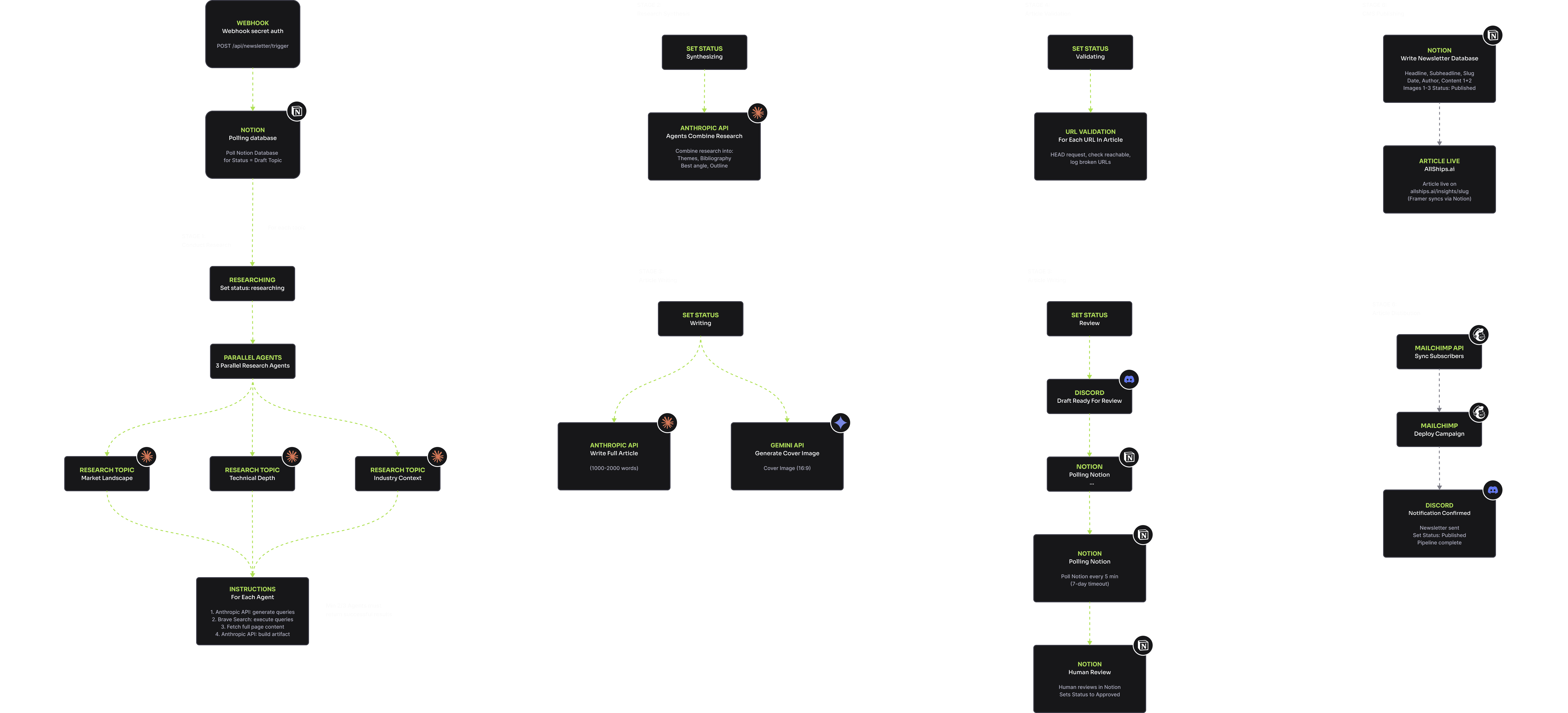 The most complex automation in the system. A background poller watches for "Draft" topics, then kicks off three parallel research agents approaching the topic from different angles. A synthesis agent distills the results into a consolidated summary. Claude produces a 1,000-2,000 word article in the AllShips editorial voice. A cover image is generated via Gemini. Every cited URL is validated. The pipeline pauses at Review status and waits for my approval — with Discord reminders and a seven-day timeout. On approval, the article publishes to Framer CMS and a Mailchimp campaign goes out. The whole flow runs autonomously with one human checkpoint: is this good enough to publish? I could have automated that gate away. But the editorial decision isn't something I'm ready to delegate. Maybe eventually. Not yet.