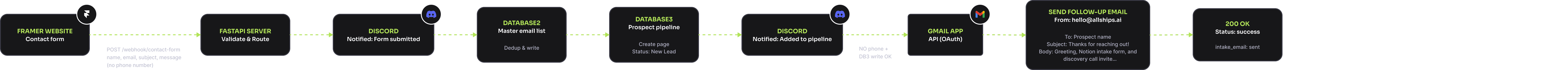 I designed and built the AllShips website in Framer, which let me move at the speed of a solo operator while keeping the design fidelity I'd hold myself to on any client project. It gave me the component architecture, responsive breakpoints, and CMS integration I needed without the overhead of a custom frontend build for what is fundamentally a marketing site. The design language came from a constraint I set early: AllShips needed to feel like a premium technology brand without feeling like an enterprise consultancy. My audience — small business owners, operators, founders — responds to confidence and clarity, not corporate jargon or dense feature matrices. I landed on a dark-mode foundation with a signature green accent that cuts through with energy and warmth. The typography pairs Sora for display with Inter for body — clean and legible at every scale. I gave every section generous space and deliberate hierarchy, letting the content breathe instead of competing for attention. One decision I'm particularly glad I made early: I structured the site as a single-page narrative and wrote every section to do double duty — compelling marketing copy on the page, and source material for the voice agent's knowledge base. That constraint actually made the writing better. If a section couldn't be understood when spoken aloud by a voice agent, it was too complex for the page. Designing for two audiences at once forced a clarity I might not have reached otherwise.