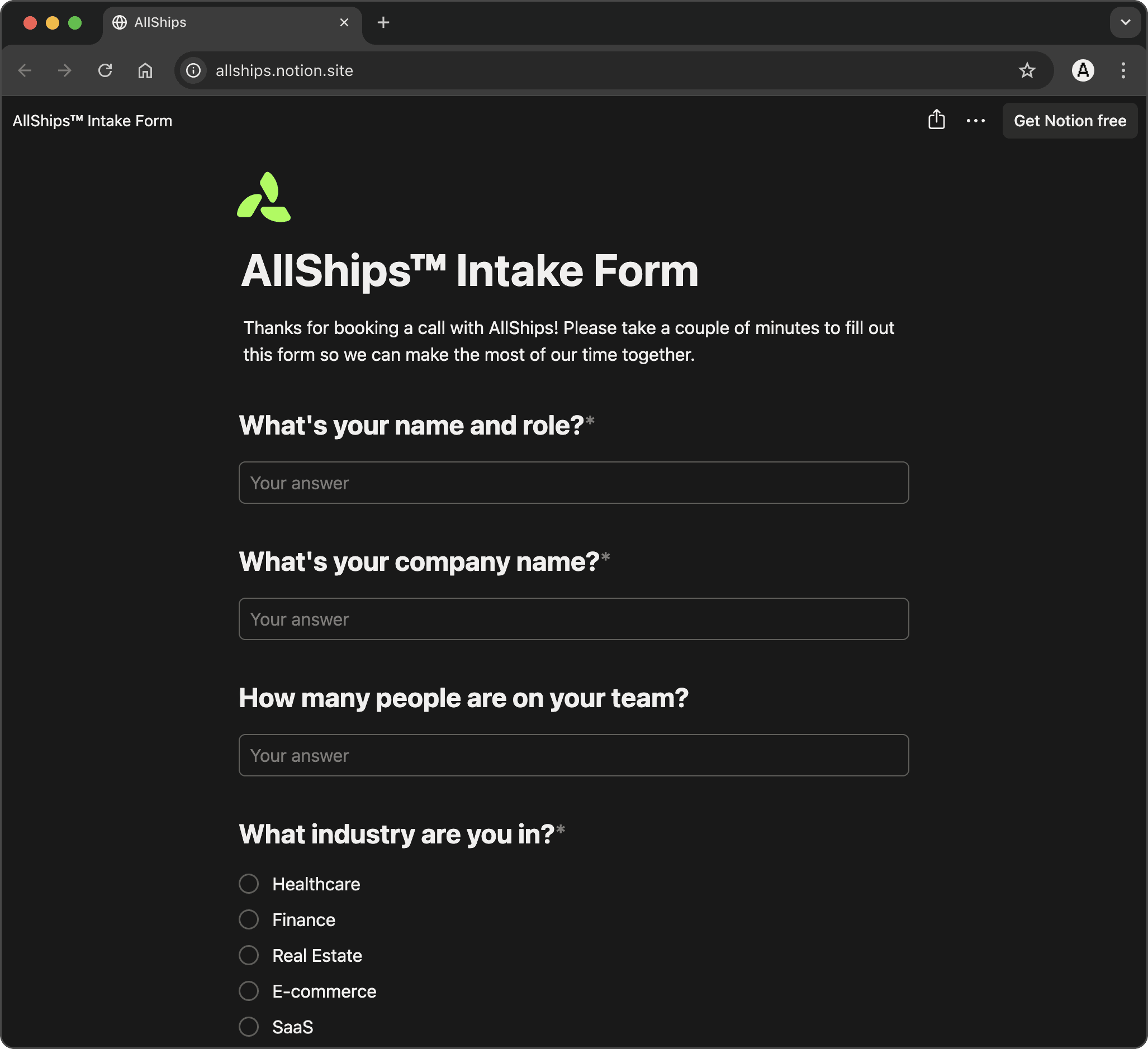 If a visitor happens to schedule a meeting instead of use the contact form they are sent an intake form, soliciting inquiry details - those details are also routed to a platform database for team review ahead of the scheduled meeting time.